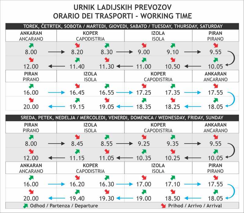 – Piran 8.00, Izola 8.45/8.55, Koper 9.25/9.35, Ankaran 9.55/10.05, Koper 10.25/10.35, Izola 11.05/11.15, Piran 12.00